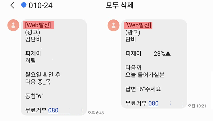 여기서 주의해야 할 부분이 한 가지 있습니다. 광고 문자와 스미싱은 내용 상단에 [Web발신]이라는 문구가 보이는데, 완전히 차단하려고 web 또는 발신을 차단 문구에 추가하면 정부나 지자체에서 발송하는 문자도 받을 수 없게 됩니다. 그리고 은행이나 기타 받아봐야 할 문자도 볼 수 없게 됩니다. 그러니 [Web발신] 문구 자체를 차단하는 것은 금물입니다.