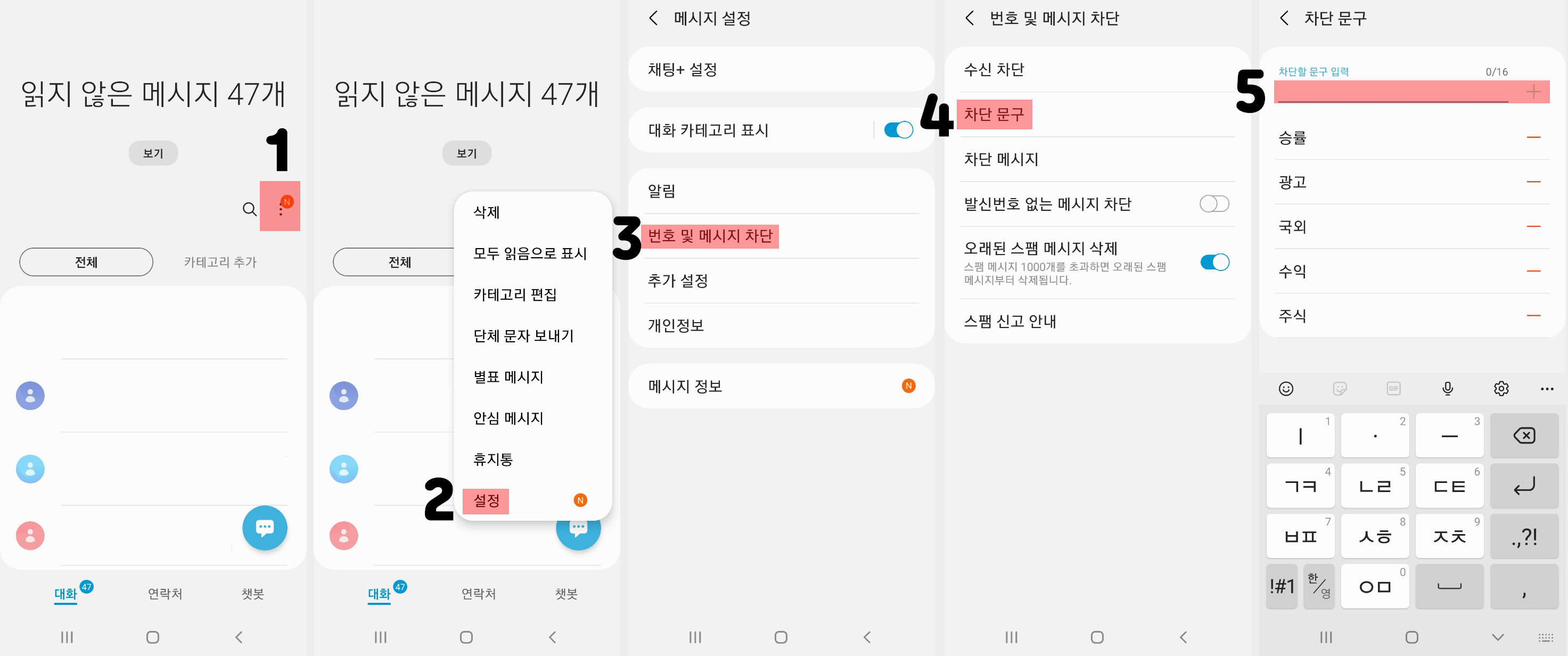 차단 문구를 저장해두면, 해당 문구가 있는 문자를 알아서 거부하는 기능이 있습니다. 설정하는 방법은 다음과 같습니다.